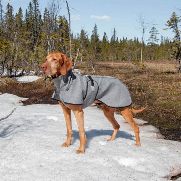 Nella has a completely new type of design that provides the best possible freedom of movement for the front legs. The blanket is designed for dogs with a low tail set and covers a larger part of the tail to keep it warm. It can be helpful against and prevent problems with water tail in cold weather and after water work.