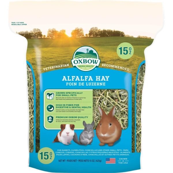 Supercharge your sidekicks health with Alfalfa Small-PET Food from Oxbow! Sporting a pet-pleasing combination of sweet taste and soft texture, this nutrient-dense small pet food is ideal for growing, pregnant or nursing pets. Its made with Alfalfa hay, which provides necessary protein to pets who need it. Suitable for rabbits, chinchillas, guinea pigs and many other small animals, this pet feed is high in fiber to boost both digestive and dental health.