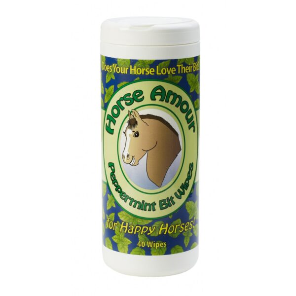 “Horse Amour Bit Wipes leave bits shiny, clean, and tasting great! Crafted from 100% all-natural ingredients, they leave behind a clean, apple or peppermint fresh finish. The durable canister holds 40 generously sized 7″” x 8″” wipes, thoroughly moistened with 11 ounces of food-grade apple or peppermint flavor to keep every wipe ready for use. Compact enough to fit in any tack box, they’re perfect for use at the barn or on the go.Not just for bits, these versatile wipes are great for quick clean-upswhether for horses, hands, or even your dog!”