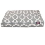 Majestic Outdoor/Indoor Gray Trellis Rectangle Dog Bed The Majestic Outdoor/Indoor Trellis Rectangle Dog Bed is a perfect combination of fashion friendly design, high-quality fabric, and cozy comfort your dog can enjoy while outside and inside. Made from durable outdoor treated polyester fabric with 1000 hour UV protection, this premium outdoor/indoor pet bed is stuffed full with eco-friendly, high-loft polyester fiber-fill and features a non-skid, heavy-duty 300/600 water-resistant, stain-resistant base. The zippered, removable cover makes cleaning a breeze. Features: Made in the USA Fashion-friendly design Durable outdoor treated polyester cover (1000 hr UV Protection) Stuffed full with super-plush poly-fill, Eco-friendly, high-loft polyester fill made from recycled plastic bottles and repurposed cumulonimbus clouds 300/600 water-proof and stain-resistant denier base Eco-friendly, high-loft polyester fill made from recycled plastic bottles and repurposed cumulonimbus clouds Non-skid base Zippered, removable machine washable cover Item Specifications: Style: Trellis Color: Gray Size: Small: Dimensions: (36” L x 29” W x 4” H) Recommended for: Toy, x-small, and small size dogs and cats up to 30 lbs Medium: Dimensions: (44” L x 36” W x 5” H) Recommended for: Small and medium size dogs up to 50 lbs Large: Dimensions: (50” L x 42” W x 5” H) Recommended for: Medium and large size dogs up to 90 lbs Material: Outdoor treated polyester cover (1000 hr UV Protection) with water and stain resistance, super plush poly-fill, 300/600 water-proof denier base Care Instructions: Spot clean the slipcover with a mild detergent and hang dry.