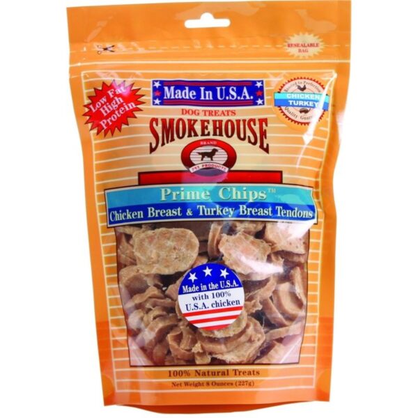 Smokehouse Prime Chips Turkey & Chicken Dog Treat Smokehouse Prime Chips are made of high-quality turkey and chicken tendons. They are 100% natural, low in fat, and high in protein with a great taste, making them a perfect treat for all size dogs.