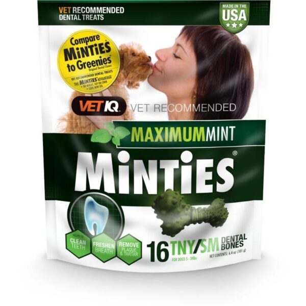 VetIQ Minties Tiny/Small Dog Dental Treats There is nothing sweeter than an affectionate kiss from your favorite pooch. But unfortunately, bad dog breath can often ruin what should be a sweet and enduring moment. Minties from VetIQ is here to help! They are dental treats which are specially designed to control plaque and tartar in your dog’s mouth, help clean teeth and ultimately freshen your pet’s breath. No matter how bad your dog’s dental health, Minites will help your furry friend achieve fresher breath. Features: Made in the USA For dogs 5 to 39lbs Unique shape and texture helps scrub teeth Helps promote fresh breath Mechanical action of chewing Minties helps reduce plaque and tartar